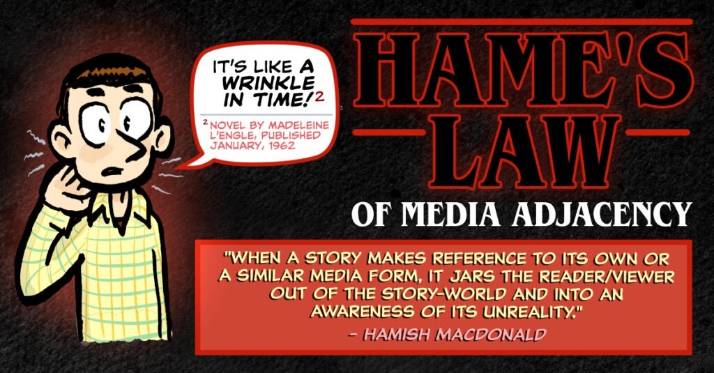 When a story makes reference to its own or a similar media form, it jars the reader/viewer out of the story-world and into an awareness of its unreality.