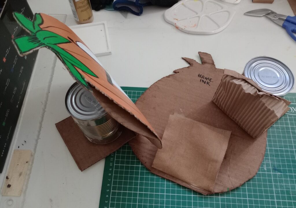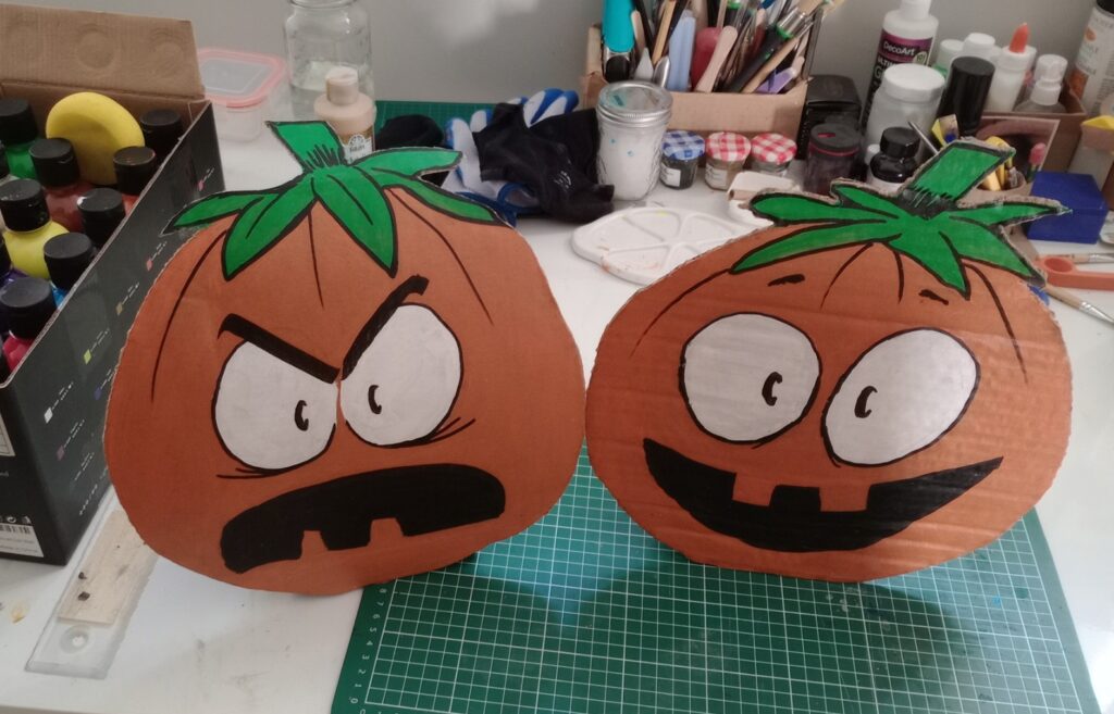 In other Hallowe’en-adjacent news, I made a pair of pumpkins to decorate our house, and to test out making cardboard cutouts for the outdoors.