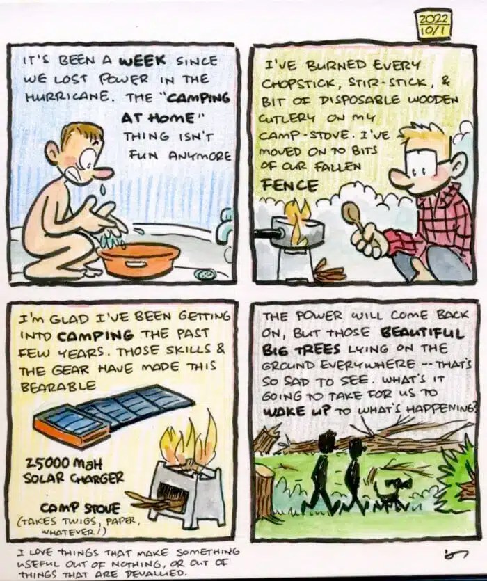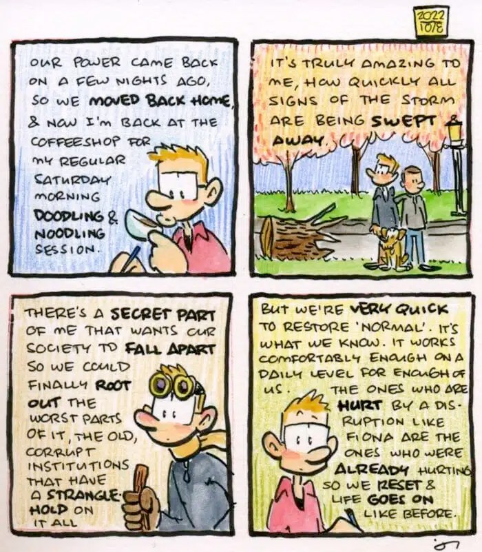 The Charlottetown Comics Club is working on a collaborative publication, and I’m making a four-page prelude to the comic strip, just so I can put my brain to rest, knowing I’ve explained the thing somewhere. But I want the strip itself to just drop in in media res, and to let go of all notions of how everything’s all going to blow up in the end. (Though it’s going to be a shitshow, because how could it not be, right? It’s not like billionaires are doing any good for Earth.)