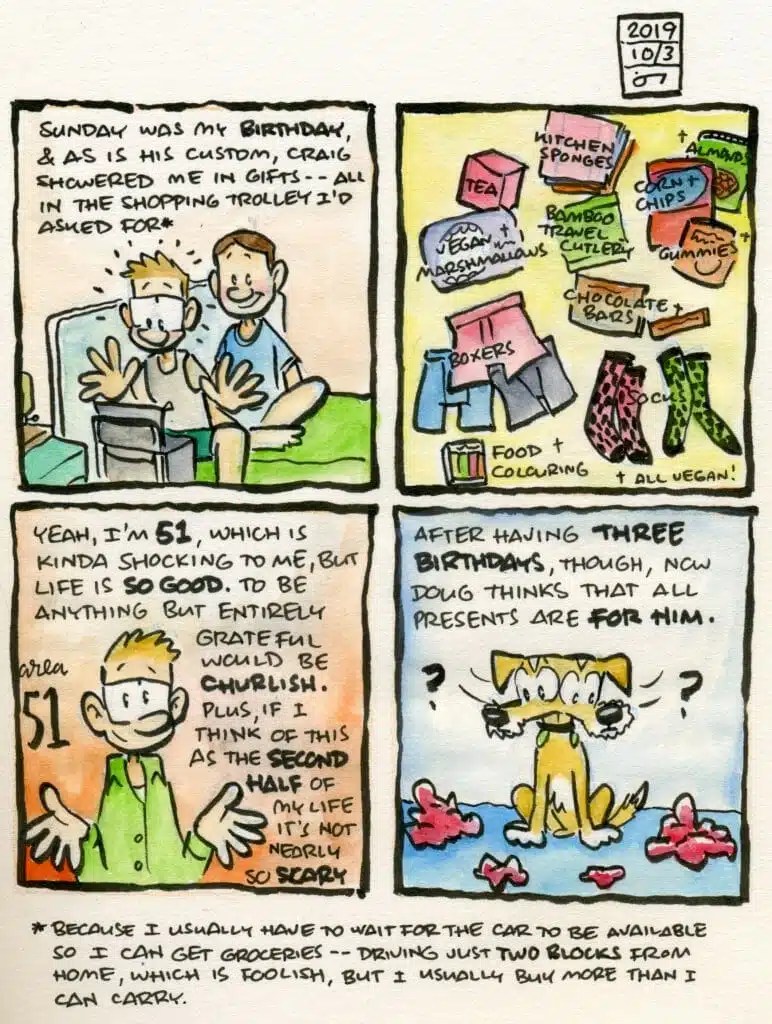 So when I go a long time without getting to at least try to catch a little life on paper, I feel stressed to the bone. And being in constant company, making beds and meals and conversation morning and night every day, even for people I love — it wears me out. Doug’s been crashed out for days, and Craig’s been pulling long days at work in-between hosting, so it’s high time for a rest-stop.