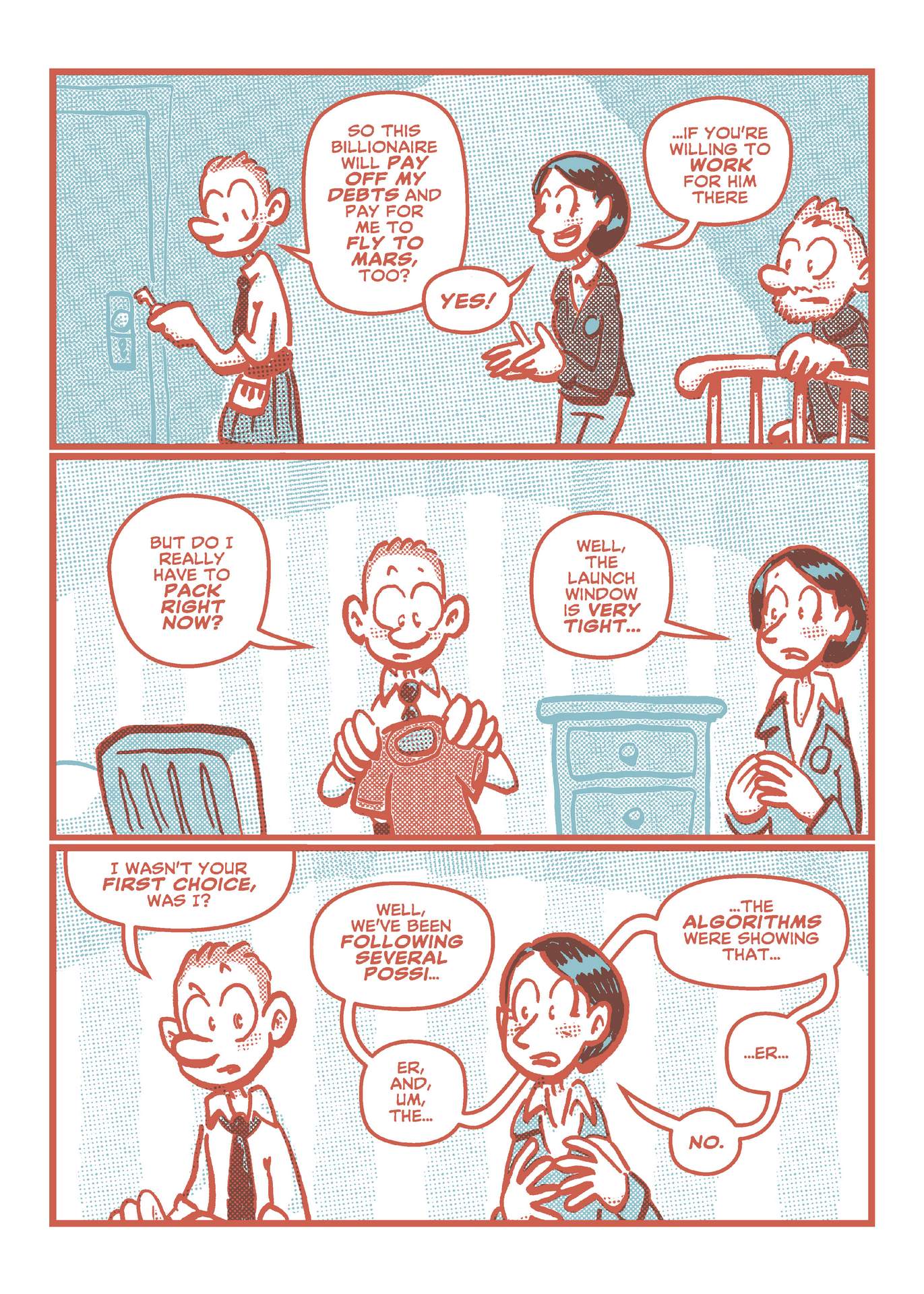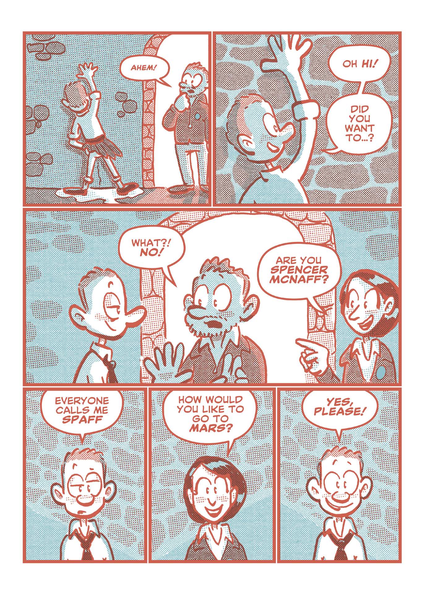 This comic first appeared in the Charlottetown Comics Club's publication "Modus". (Which was printed in a two-colour Riso style. The later Marsholes comic book is finished in watercolour and coloured pencil.)